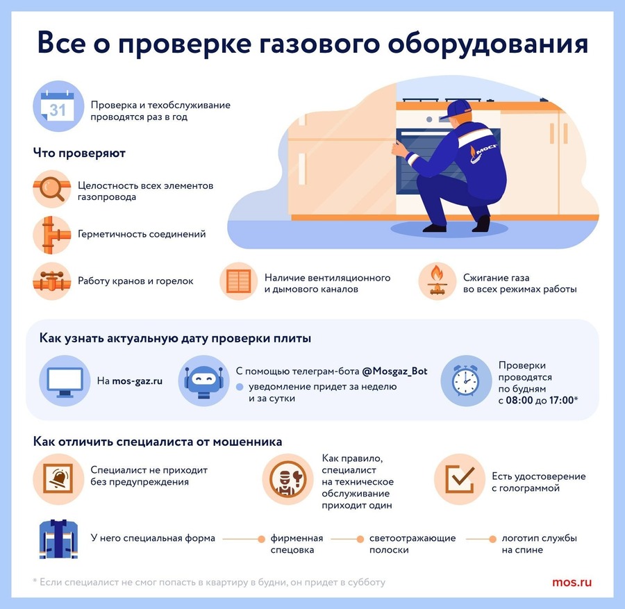Специалисты АО «Мосгаз» ежегодно проводят техническое обслуживание внутридомовых и внутриквартирных систем, чтобы они работали бесперебойно и безопасно. О том, как правильно обращаться с газовыми приборами, чтобы не допустить аварийных ситуаций нужно придерживаться определенных правил.
